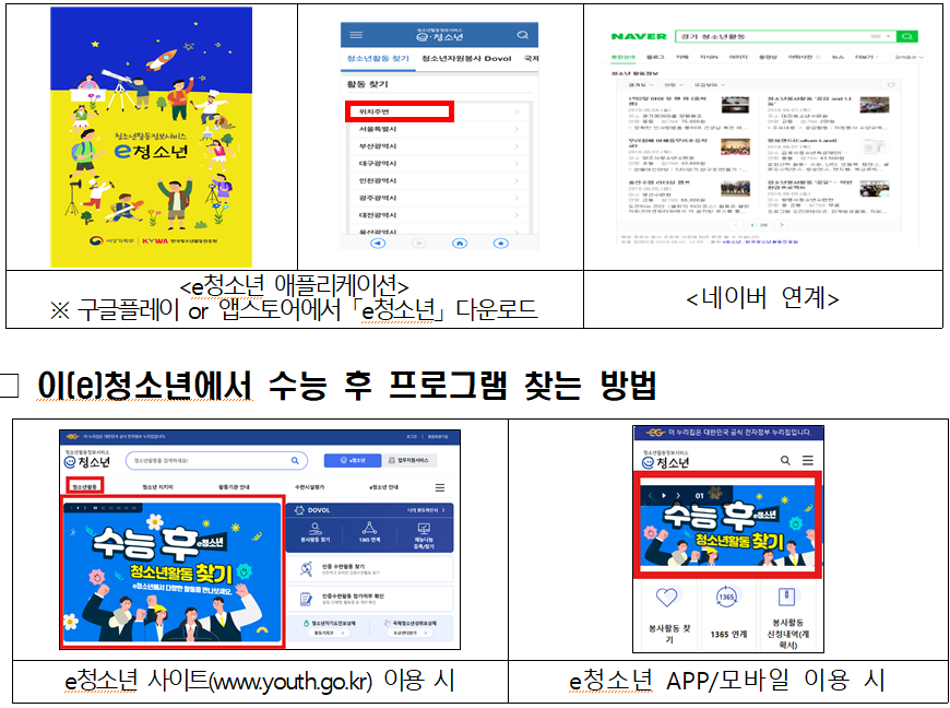 한편, 청소년활동정보서비스 이(e)청소년은 청소년수련시설과 공공기관이 운영하는 다양한 활동 정보를 제공하는 종합 플랫폼으로, 위치 기반 검색 기능을 활용해 가까운 프로그램을 쉽게 찾을 수 있으며, 앱(APP)으로도 이용 가능하다.