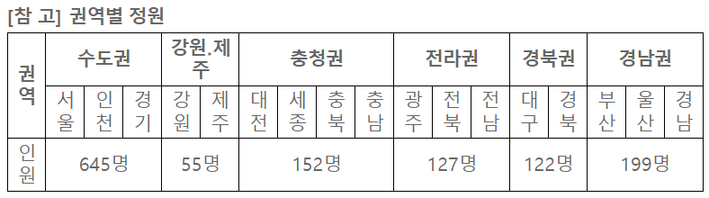 권역별 정원은 수도권 645명, 강원·제주 55명, 충청권 152명, 전라권 127명, 경북권 122명, 경남권 199명 등 총 1,300명이다.