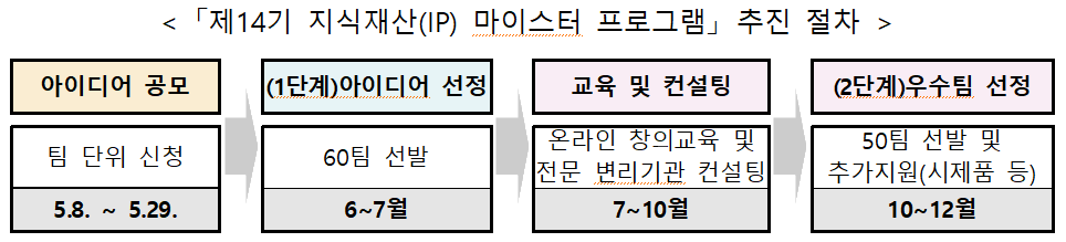 교육부(부총리 겸 교육부장관 이주호)는 6일 중소벤처기업부(장관 오영주) 및 특허청(청장 직무대리 김시형)과 협력하여 ‘제14기 지식재산(IP) 마이스터 프로그램’의 참가자 모집을 5월 8일부터 29일까지 진행한다고 밝혔다.