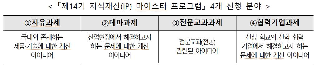 또한 제14기 지식재산 마이스터 프로그램은 자유과제, 테마과제, 전문교과과제, 협력기업과제의 4개 분야로 구성되며, 테마과제 분야는 34개 대기업 및 중견·중소기업, 공공기관에서 제안한 과제로 이루어져 있다.
