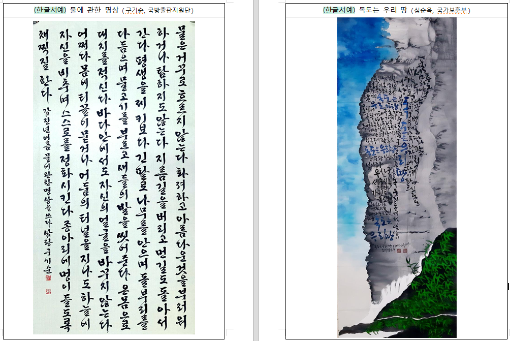 수상작으로는 ‘물에 관한 명상’ 등 서예 10점, ‘보름밤의 대숲’ 등 문인화 5점, ‘소풍(민화)’ 등 한국화 6점, ‘엄마의 창’ 등 서양화 11점, ‘노을’ 등 사진 13점, ‘사랑의 메아리2’ 등 공예 2점, 그리고 디지털드로잉 부문에서 ‘가을날의 과일가게’ 등 3점 포함해 총 50점이다.
