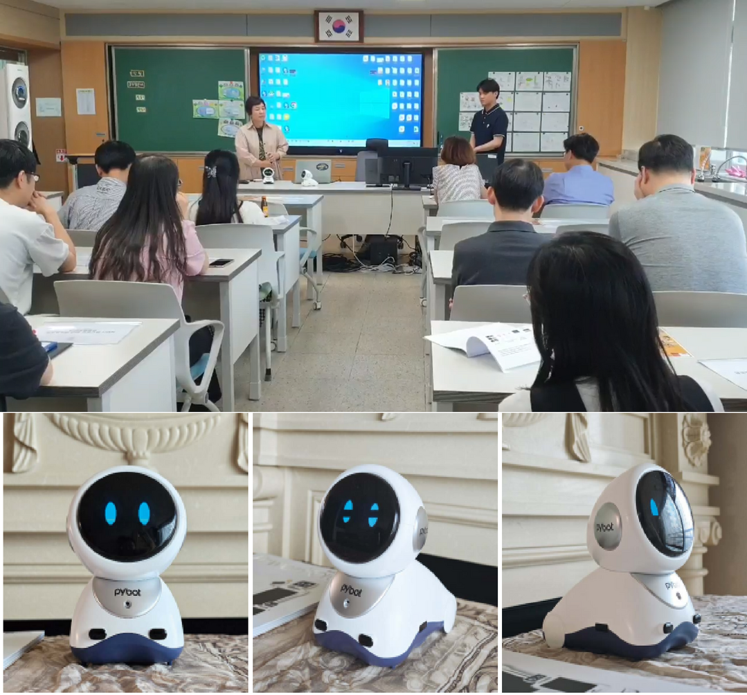 <사진=(위)㈜유닛컴퍼니(대표 최선희)가 지난 25일 당진초등학교에서 초등학교 교사들을 대상으로 자체개발한 코딩교육 로봇 ‘파이봇(PYBOT)’에 대한 시연회를 열었다. (아래) ㈜유닛컴퍼니(대표 최선희)의 코딩교육 로봇 ‘파이봇(PYBOT)’>