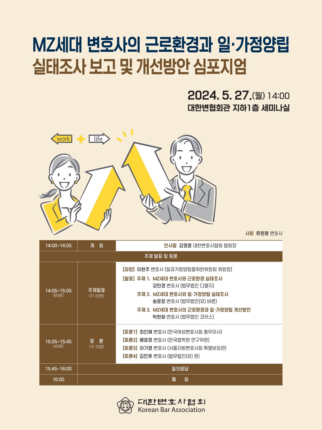 전체 사회는 류원용 변호사가 진행하며, 토론자로는 최인해 변호사(한국여성변호사회 총무이사), 배효정 변호사(한국법학원 연구위원), 이기영 변호사(서울지방변호사회 특별보좌관), 김민후 변호사(법무법인(유) 원)가 참석했다.