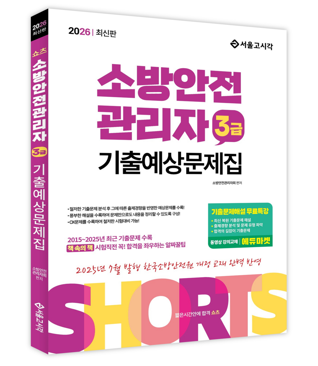 이 같은 흐름에 맞춰 서울고시각은 3급 소방안전관리자 시험을 준비하는 수험생들의 학습 부담을 덜기 위해 ‘2026 쇼츠 소방안전관리자 3급 기출예상문제집’을 출간했다. 이번 교재는 2025년 7월 발행된 한국소방안전원 개정 교재의 내용을 전면 반영해 최신 출제 경향에 맞춰 구성됐다.