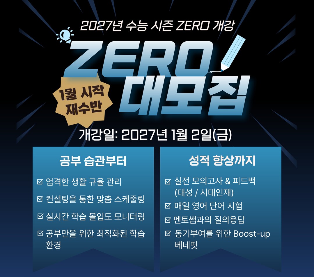 이번 시즌 ZERO 재수반은 2027학년도 수능을 목표로 하는 재수생을 대상으로 2026년 1월부터 운영된다.