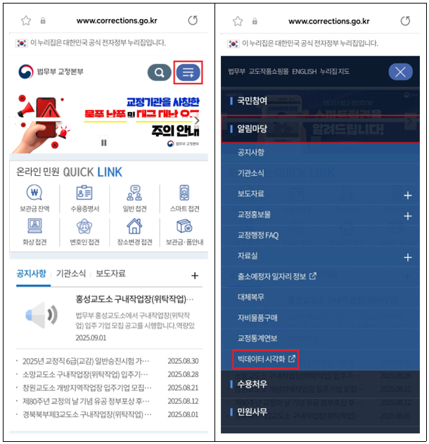 | ▲법무부 교정본부 누리집(https://www.corrections.go.kr)‘알림마당’ 내‘빅데이터 시각화’ |