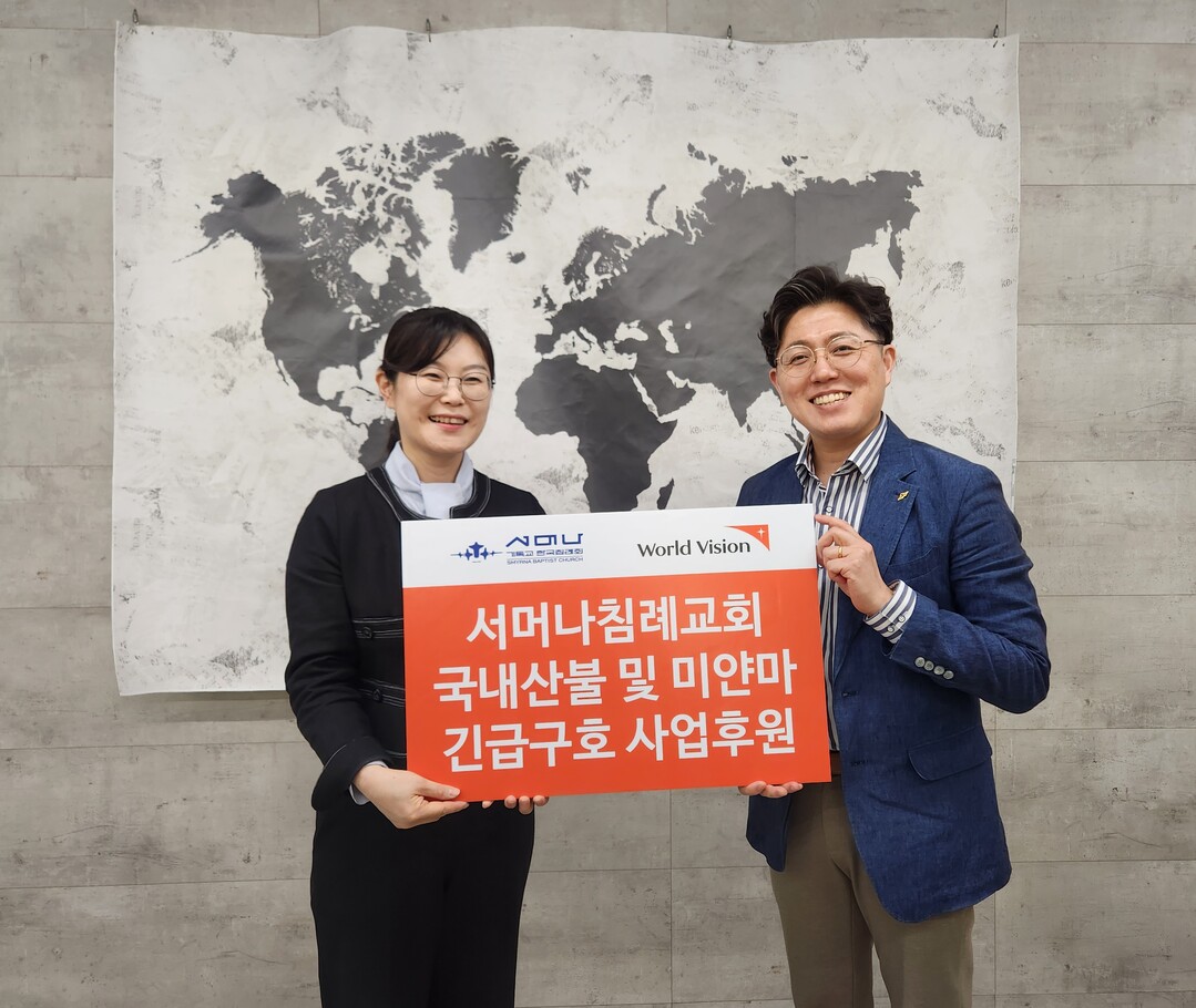 서머나침례교회(담임목사 배지현)에서 300여만원의 후원금이 월드비전 대전세종충남사업본부(본부장 강은희)에 전달됐다. 해당 후원금 중 200만원은 국내 산불긴급구호사업에 사용될 예정이며, 100만원은 미얀마 강진 피해 복구를 위한 긴급구호사업으로 사용될 예정이다.