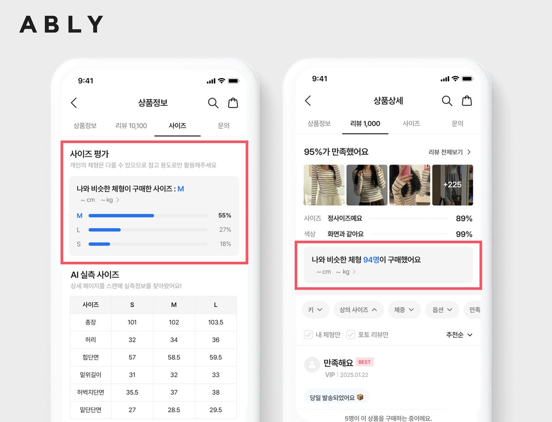 에이블리코퍼레이션(대표 강석훈)이 운영하는 스타일 커머스 플랫폼 에이블리가 의류 구매 시 사이즈 선택이 더욱 중요해지는 가운데, 고객 맞춤형 쇼핑 경험을 제공하기 위해 사이즈 추천 기능을 업그레이드했다고 1일 밝혔다. 빅데이터 기반 분석을 바탕으로 최적의 사이즈를 추천하고, 상품 상세 페이지 내 정보를 통합해 쇼핑 동선을 간소화했다.