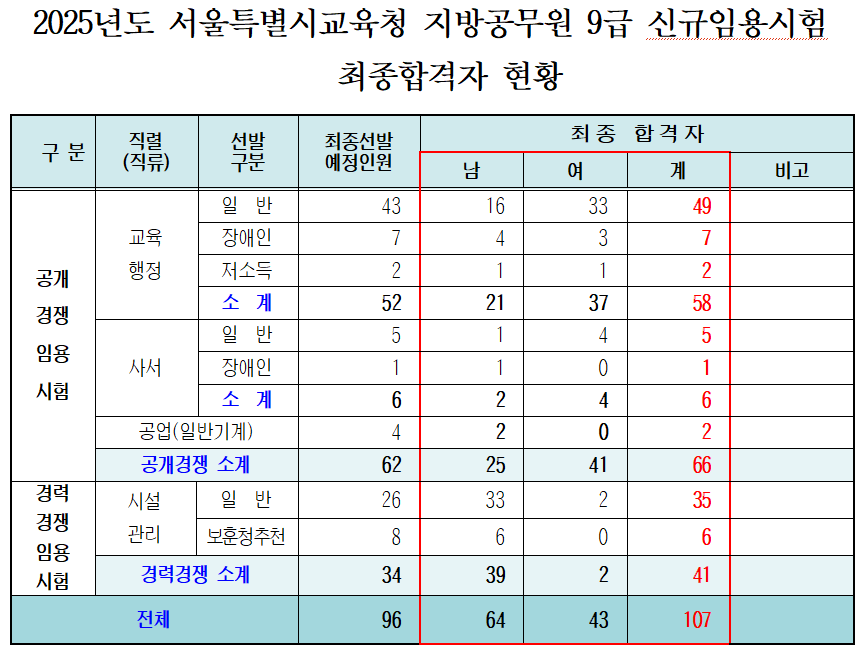 직렬별 합격 인원은 ▲교육행정 58명(장애인 7명, 저소득층 2명 포함) ▲사서 6명(장애인 1명 포함) ▲공업 2명(일반기계 2명) ▲시설관리 41명(국가유공자 6명 포함)으로 나타났다.