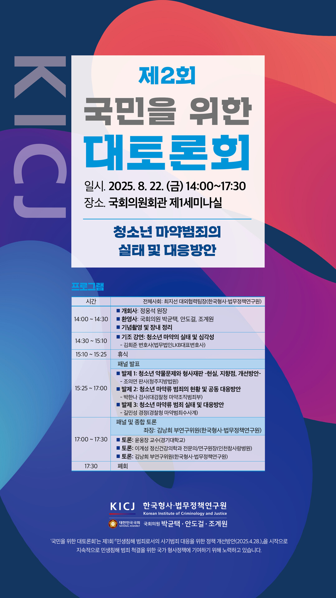 한국형사‧법무정책연구원(원장 정웅석)은 오는 22일 국회의원회관 제1세미나실에서 『제2회 국민을 위한 대토론회』를 개최한다고 밝혔다. 이번 주제는 ‘청소년 마약범죄의 실태 및 대응방안’이다.