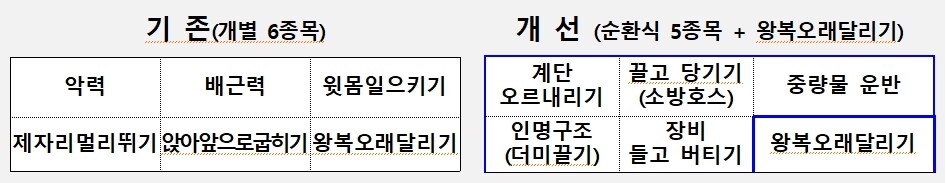 지난해 선발시험부터 체력시험의 반영비율을 15%에서 25%로 상향했고, 그동안 기초체력 위주의 개별 6개 종목 측정방식에서 직무특성을 반영한 순환식 5개종목+왕복오래달리기로 개선할 예정이다.