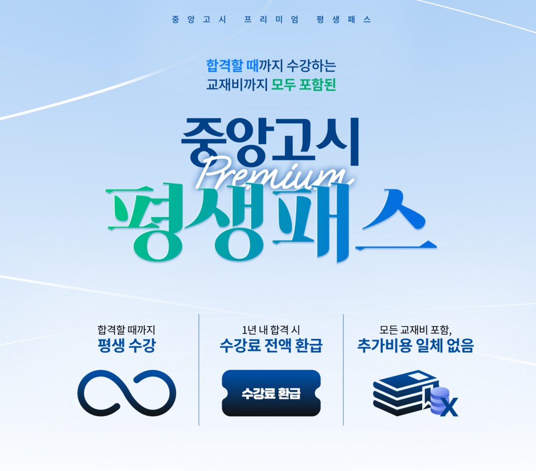 중앙고시교육원이 운영하는 평생회원 패키지는 간호직, 보건직, 의료기술직, 보건진료직 시험을 준비하는 강의와 교재가 모두 포함된 패키지이다. 수강 등록 후 1년 이내 최종 합격 시 수강료 전액을 환급해주는 장학제도를 운영하고 있으며, 시험에 응시했으나 불합격할 경우에는 무료로 1년씩 강의를 연장해 합격할 때까지 추가 비용 없이 수강할 수 있도록 지원한다.