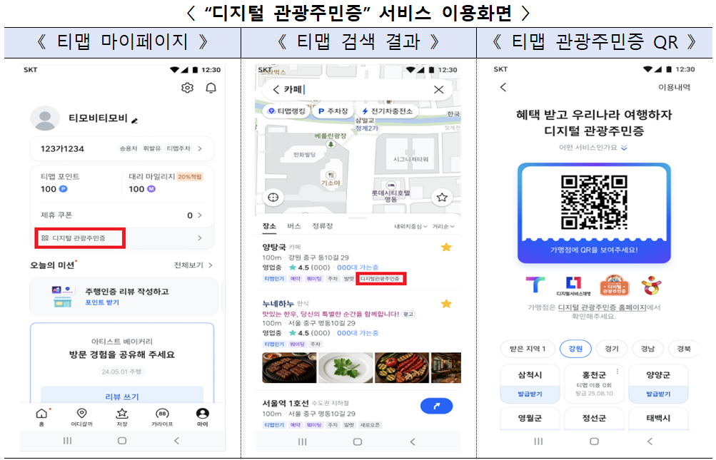 ‘디지털 관광주민증’은 인구감소 지역에 방문한 관광객이 명예 주민으로 등록해 식음료, 체험, 숙박, 관람 등 다양한 할인 혜택을 누릴 수 있도록 한 서비스다. 공공서비스 혁신을 위한 정부의 ‘디지털서비스 개방’ 정책에 따라, 해당 서비스를 티맵 등 민간 플랫폼으로 확대한 것이다.