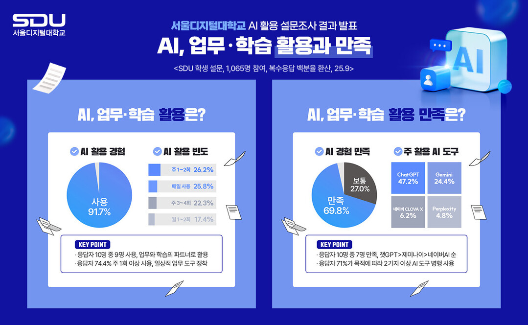 재학생 1천 65명이 참여한 이번 조사는 지난해 10월 13일부터 27일까지 진행되었으며, AI 활용의 일상화 수준은 물론 실제 성과로 이어지는 활용 역량에 대한 학습자들의 인식과 실무 교육 수요를 종합적으로 분석했다.