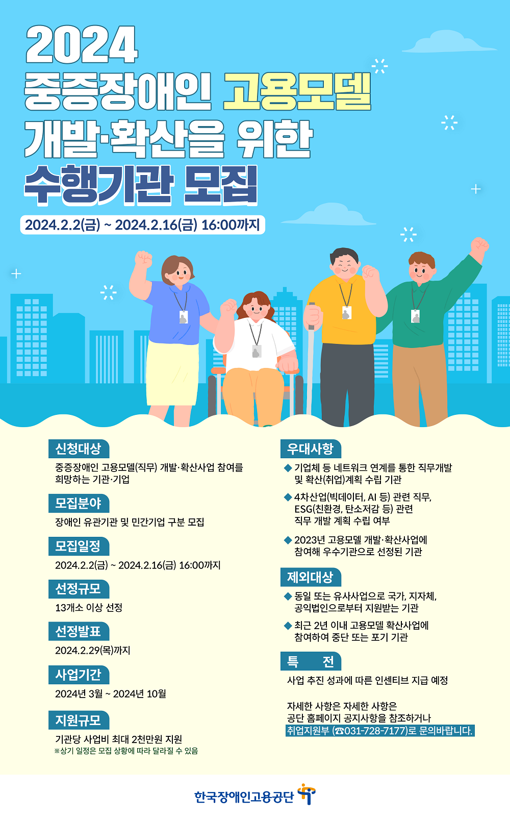 [피앤피뉴스=마성배 기자] 한국장애인고용공단(이사장 조향현)은 2일 중증장애인을 위한 다양한 직무개발 노력을 통해 실질적인 고용 확대를 도모하고자 2024년도 중증장애인 고용모델 개발·확산 사업을 함께 할 기업 및 기관을 모집한다고 밝혔다.