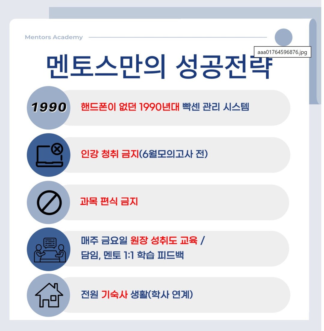 대치동 멘토스학원은 소수정예 재수학원의 원조학원으로 25년 된 강남 대치동에서 메가스터디 다음으로 오래된 학원이다. 2027년 수능대비 재수정규반은 예약중에 있다.