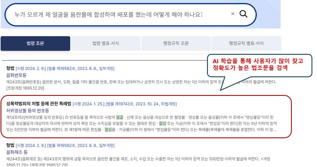 현재 시스템은 약 71만 건의 법령 정보와 2만 4천 건의 법률 관련 질의·답변 데이터셋을 AI가 학습하는 과정을 통해 발전하고 있으며, 사용자의 질문 의도를 파악하는 AI 인지검색 기술을 적용해 더욱 정확한 검색 결과를 제공할 예정이다.