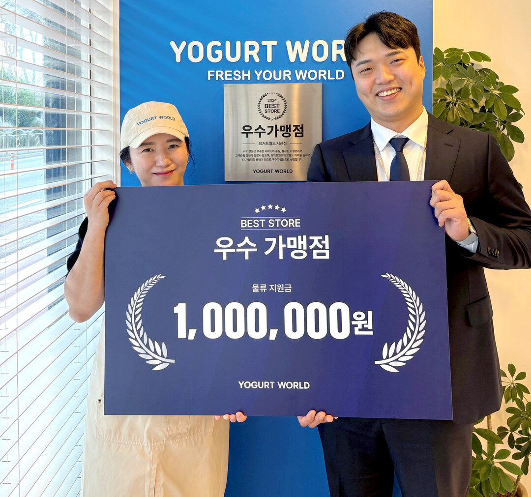 디저트카페 요거트월드가 2024년 우수 가맹점 2곳을 선정하고, 각 매장에 우수 가맹점 현판과 물류지원비 100만 원을 지원하며 본사와 가맹점 간의 상생 경영을 강화하고 있다고 밝혔다.