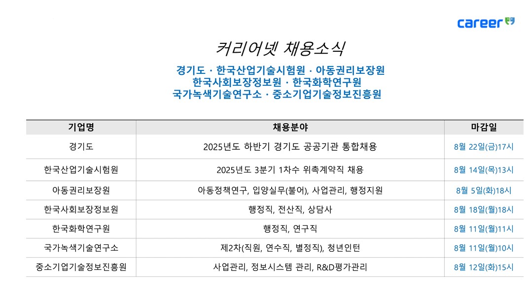 [피앤피뉴스=마성배 기자] 공공부문 하반기 채용이 본격화되면서 경기도와 산하기관을 비롯한 다수 기관이 대규모 인재 모집에 나섰다. 취업포털 커리어는 5일 기준으로 경기도, 한국산업기술시험원, 아동권리보장원, 한국사회보장정보원, 한국화학연구원, 국가녹색기술연구소, 중소기업기술정보진흥원 등 7개 기관의 채용 소식을 발표했다.