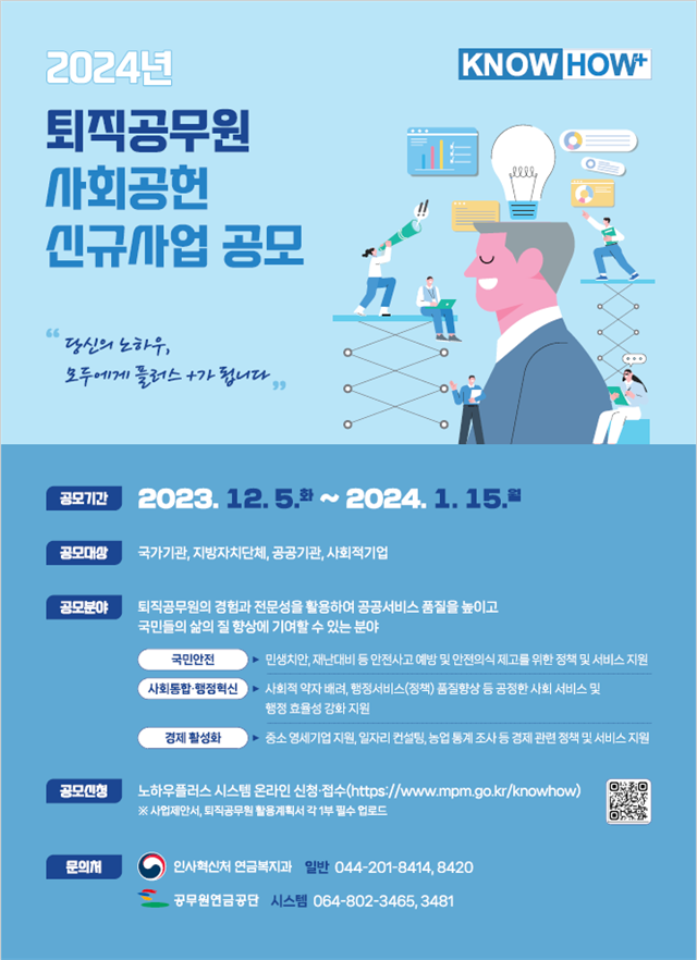 인사혁신처(처장 김승호)는 12일 저출산·고령사회에 대응하는 전략적인 퇴직 인력 활용을 위해 ‘2024년 퇴직공무원 사회공헌사업’ 대상을 확대·추진한다고 밝혔다.