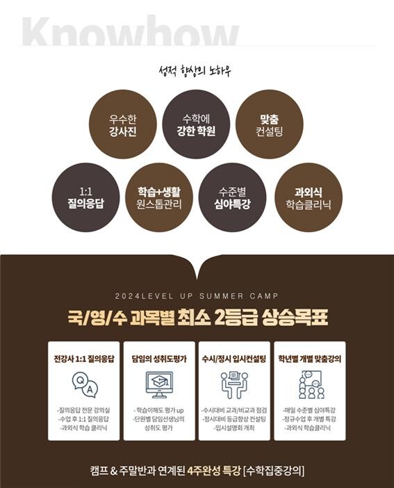 캠프 개강 첫날 레벨테스트를 진행해 학생 성적에 따라 수준별 반 편성과 시간표를 구성하고 학생 수준에 따른 교육 커리큘럼을 제공한다. 수업은 기본 실력을 다지는 단계부터 최고난도 문제까지 자료가 담긴 학원 자체 교재를 활용해 국어, 수학, 영어 필수 과목을 지도하고 과학탐구, 사회탐구, 수리논술은 학생 필요에 따라 제공하고 있다. 또한 집중 관리가 필요한 과목이 있을 경우 일대일 클리닉을 통해 학습에 부족한 부분을 보완할 수 있도록 돕고 있다.