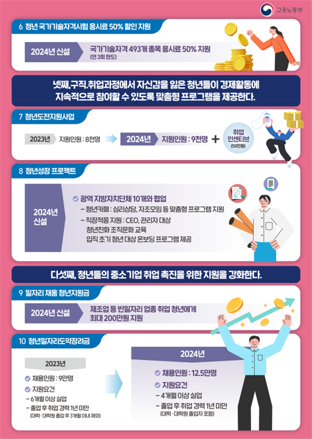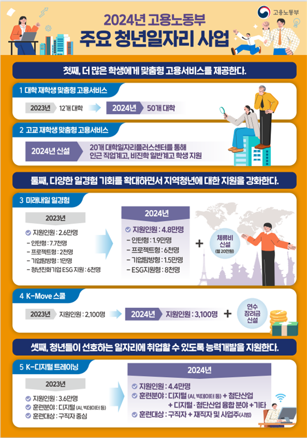 고용노동부는 청년들이 경쟁력을 갖춰 첫 취업에 성공할 수 있도록 인턴, 프로젝트 등 다양한 일경험 프로그램을 확대할 예정이다. 올해에는 2.6만 명에서 4.8만 명으로 증원할 계획이다.