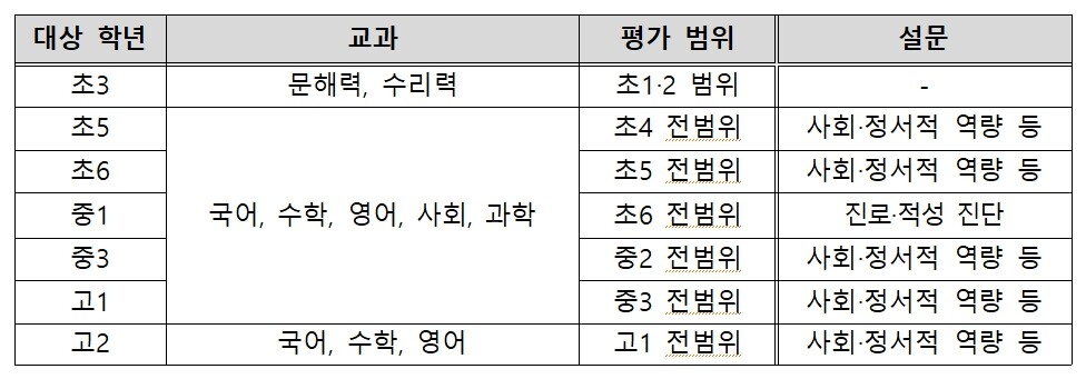 올해는 초3, 중1 책임교육학년을 조기에 도입해 총 7개 학년 학생의 학력을 진단할 수 있도록 했으며, 종국적으로는 초3부터 고2까지 전 학년을 평가 대상으로 확대할 계획이다.
