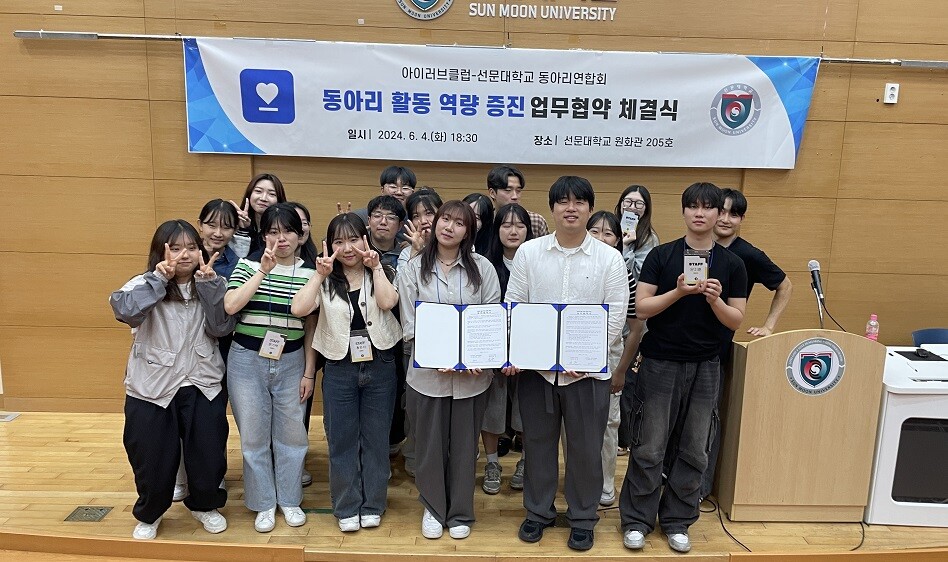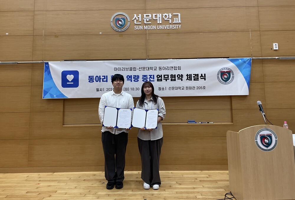 송준 대표, 선문대학교 제33대 동아리연합회 고규리(응급구조학과 21학번) 회장이 함께 한 협약식에서의 금번 협약에 따라 양측은 상호교류와 활용을 통하여 공동협력 체제를 확립하고, 이를 통해 동아리 활동역량 증진 및 생태계 조성을 위하여 협력해 나간다는 계획이다.