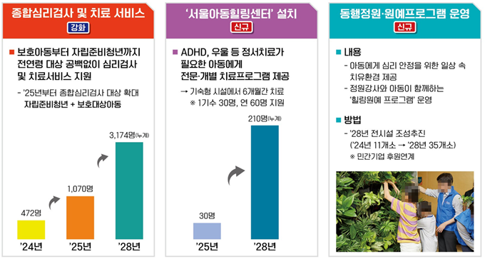 또한, 13세 이상 아동들이 독립된 공간을 가질 수 있도록 '28년까지 모든 시설에 ‘1인 1실’ 거주공간을 마련하고, 정서치료가 필요한 아동에게 전문·개별 치료서비스를 제공할 ‘서울아동힐링센터’도 내년부터 운영을 시작한다.