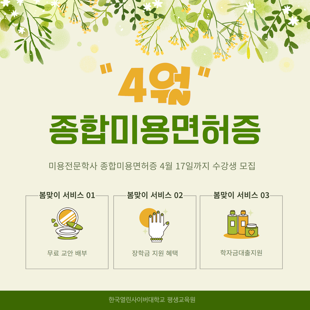 한편, 한국열린사이버대학교 평생교육원의 미용전문학사 종합미용면허증 과정은 실력 있는 아티스트 및 교수진을 통해 국내외 뷰티 트렌드 및 레퍼런스를 기반으로 최상위 수준의 과정을 제공한다.