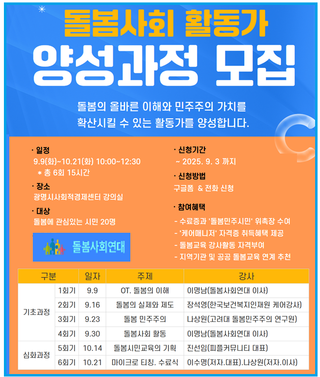 강사진은 돌봄 분야에서 전문성을 인정받은 인물들로 꾸려졌다. 이명남 돌봄사회연대 이사, 요양시설창업 전문회사 효벤트 장석영 대표, 나상원 고려대 돌봄민주주의 연구원, 진선임 피플크뮤니티 대표, 이수명 돌봄학개론 저자 등이다.