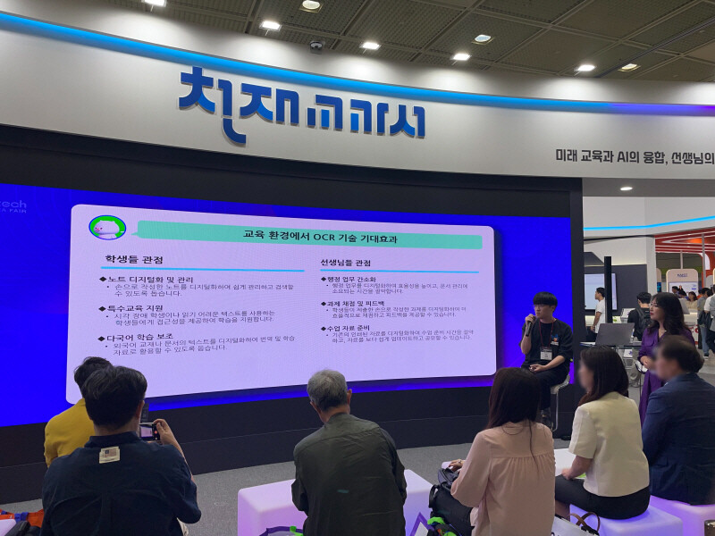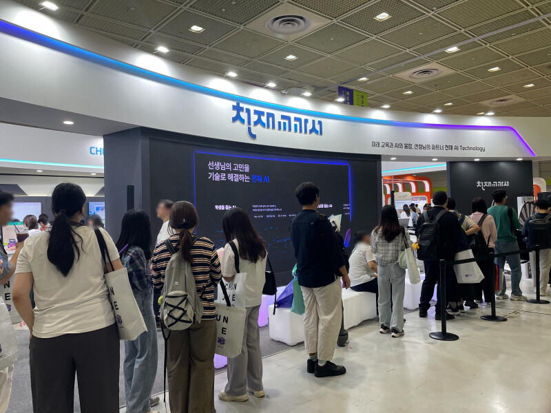 오전 10시, 입장이 시작되자마자 긴 줄이 늘어선 천재교과서 전시 부스는 곧 인산인해를 이루기 시작했다. 에듀테크 코리아 페어 2일차인 24일. 'AI가 이끄는 에듀테크의 미래'를 주제로 한 이번 박람회에서 천재교과서 전시 부스는 단연 최고 인기를 누리며, 빈자리를 찾기 힘들 정도로 북적이는 모습을 보였다.
