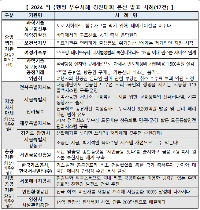 26일 정부세종청사에서 열린 본선 심사 및 시상식에는 중앙행정기관, 지방자치단체, 공공기관, 지방 공공기관 등 289개 기관에서 제출한 570여 건 중 선발된 17건이 진출했다.