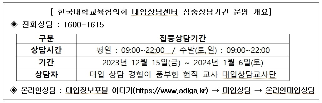 2024학년도 수시 합격자발표 마감일부터 정시 원서접수 마감 시까지 교육부와 한국대학교육협의회가 ‘집중상담기간’을 운영해 학생들에게 전화나 온라인으로 대입 상담을 제공한다고 안내했다.