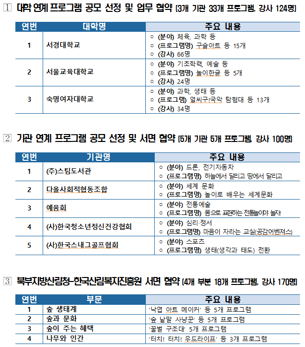 ‘대학 연계 프로그램 지원 사업’은 서경대, 서울교대, 숙명여대 등 3개 대학과 함께 추진하고, 각 대학에서 예술, 체육, 과학, 기초학력 등 대학별로 특화된 33개의 맞춤형 교육 프로그램을 지원하며, 프로그램 운영을 위한 강사 124명을 지원할 예정이다.