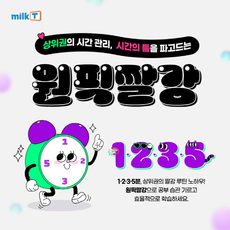 밀크T중학 관계자는 “원픽짤강은 1·2·3·5분이라는 짧은 시간에 집중력을 최대로 발휘할 수 있게 만들어졌다. 학습 효과는 물론, 시간 관리 습관을 형성하는 데에도 도움이 될 것”이라고 전했다.