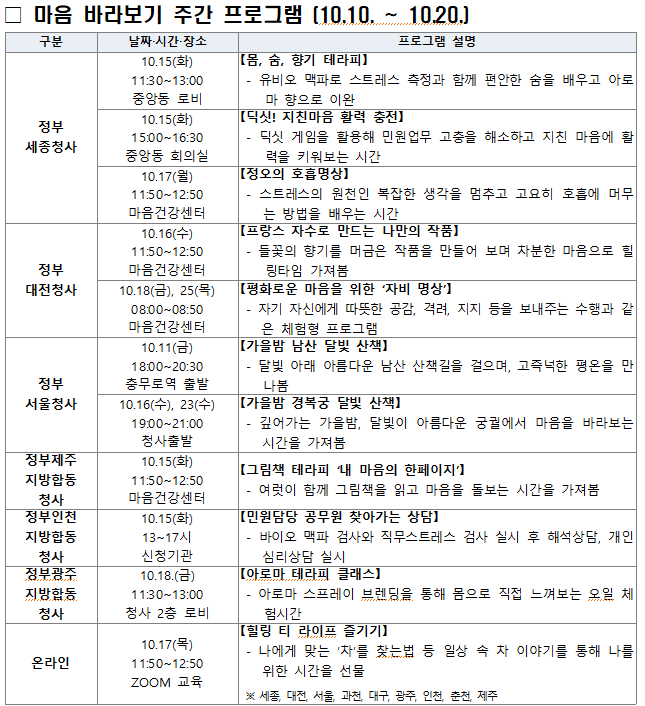 특히, 10월 15일에는 세종청사 민원동에서 민원 담당 공무원들을 위한 다양한 마음건강 프로그램이 진행된다.