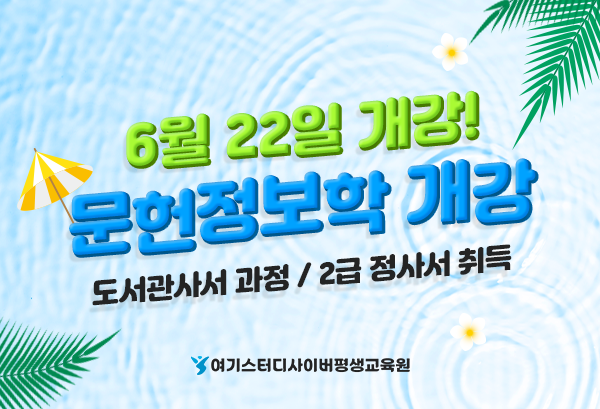 한편 여기스터디사이버평생교육원은 6월 22일 개강에 문헌정보학 학위취득 과정과 함께 경영학, 심리학, IT(컴퓨터공학) 전공 학위취득과 7개 국가자격증(▲사회복지사 2급 ▲보육교사 2급 ▲장애영유아를 위한 보육교사 ▲청소년지도사 2급,3급 ▲평생교육사 2급 ▲한국어교원 2급 ▲건강가정사) 취득과정을 함께 개강한다.