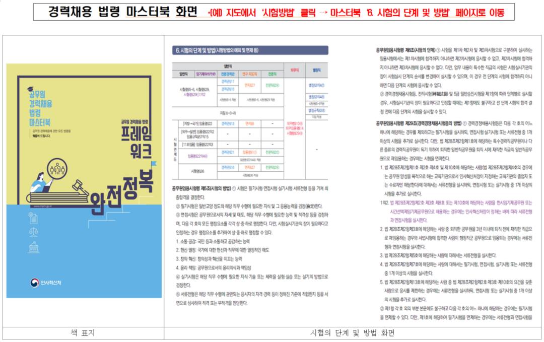‘경력채용 지도’와 함께 제공되는 ‘공무원 경력 채용법령 전자책’은 42개의 채용 관계 법령을 체계적으로 재분류한 자료다. 이 전자책은 총칙, 결격사유 및 응시 자격, 응시요건, 시험 절차, 임용관리 등 총 7개 분야 55단계로 세분화해 채용 과정에서 필요한 정보를 단계별로 제공한다.