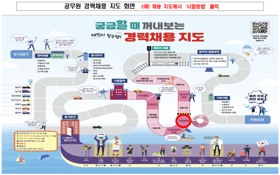 ‘경력채용 지도’는 공무원 경력채용의 법령과 절차를 하나의 여정처럼 시각적으로 구성한 도구다. 복잡한 법령 체계와 시험 절차를 쉽게 이해할 수 있도록 설계됐으며, 채용 담당자들이 업무에 빠르게 적용할 수 있도록 지원한다.