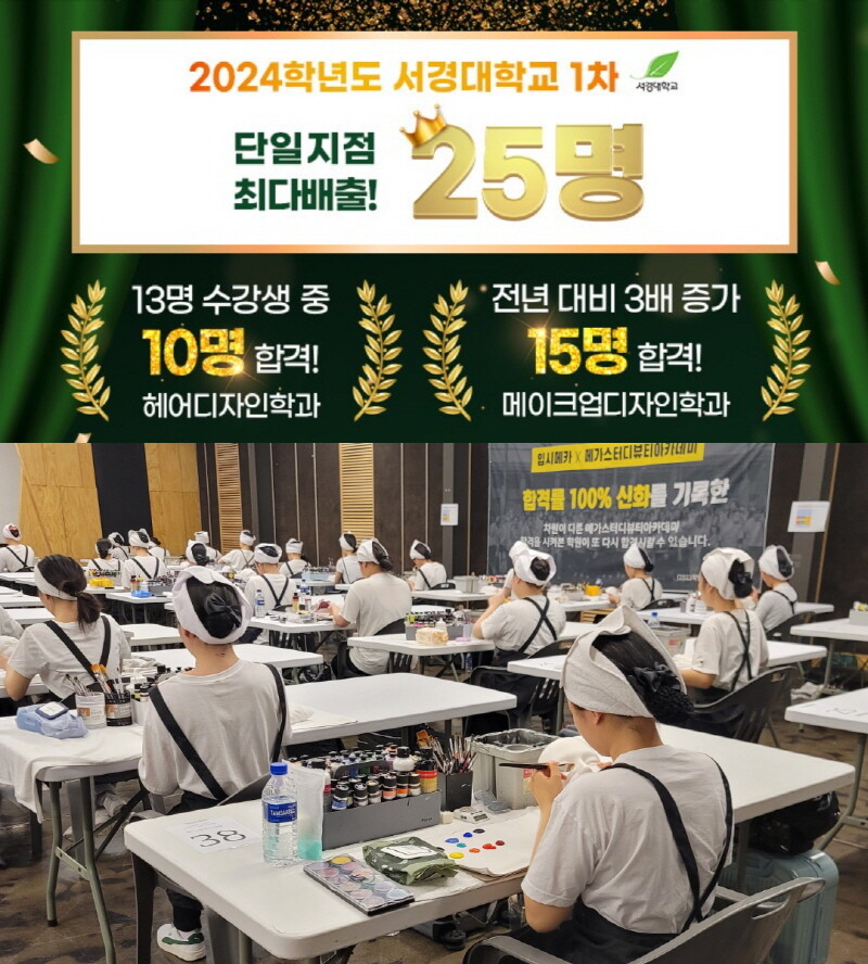메가스터디뷰티아카데미는 2024학년도 미용 입시에서 서경대학교 헤어학과 10명, 메이크업학과 15명으로 총 25명의 1차 합격생을 배출했다. 메이크업학과 합격자는 전년 대비 3배 증가한 수치를 기록했으며, 헤어디자인학과는 첫 기수부터 무려 77%의 합격률을 달성했다.