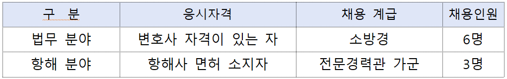 법무 분야는 변호사 자격증 소지자를 대상으로 하며, 소방경 계급으로 총 6명을 채용한다. 지역별 채용 인원은 ▲대구 1명 ▲대전 2명 ▲충남 1명 ▲전북 2명이다.