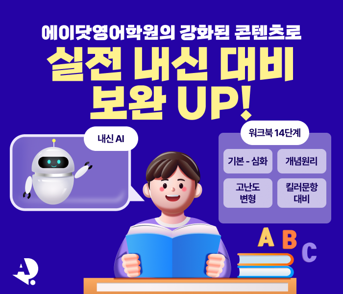 한편 에이닷 영어학원의 개정교과 대비 내신 영어 학습 콘텐츠 ‘내신AI + 워크북 14단계 과정’은 전국 88개 지점에서 운영되며, 학생의 학교와 수준에 맞춘 1:1 맞춤 상담을 통해 수업 안내를 받을 수 있다.