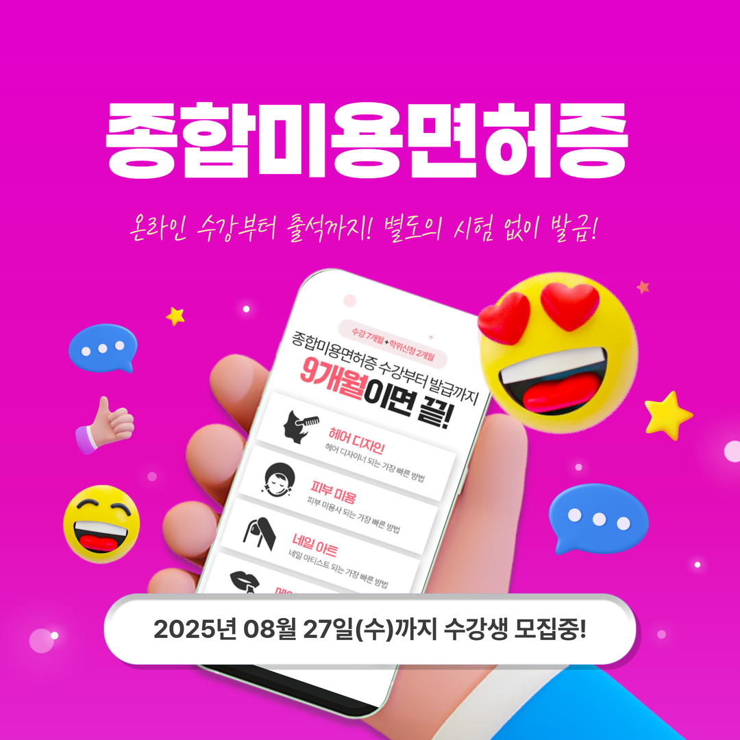 종합미용면허증은 미용사(일반), 피부, 네일, 메이크업 등 미용 전 분야에 대한 국가공인 자격증으로, 관련 이론만 이수하면 실습 없이도 자격증 취득이 가능하다는 점에서 비전공자나 초보자에게도 진입장벽이 낮은 것이 특징이다.