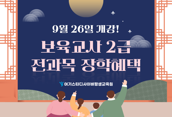 한편 여기스터디사이버평생교육원의 9월 26일 개강에는 보육교사 2급 자격증 포함 총 7개 국가자격증 취득과정과 학사/전문학사 학위취득 과정까지 총 124개 과목이 개강한다.