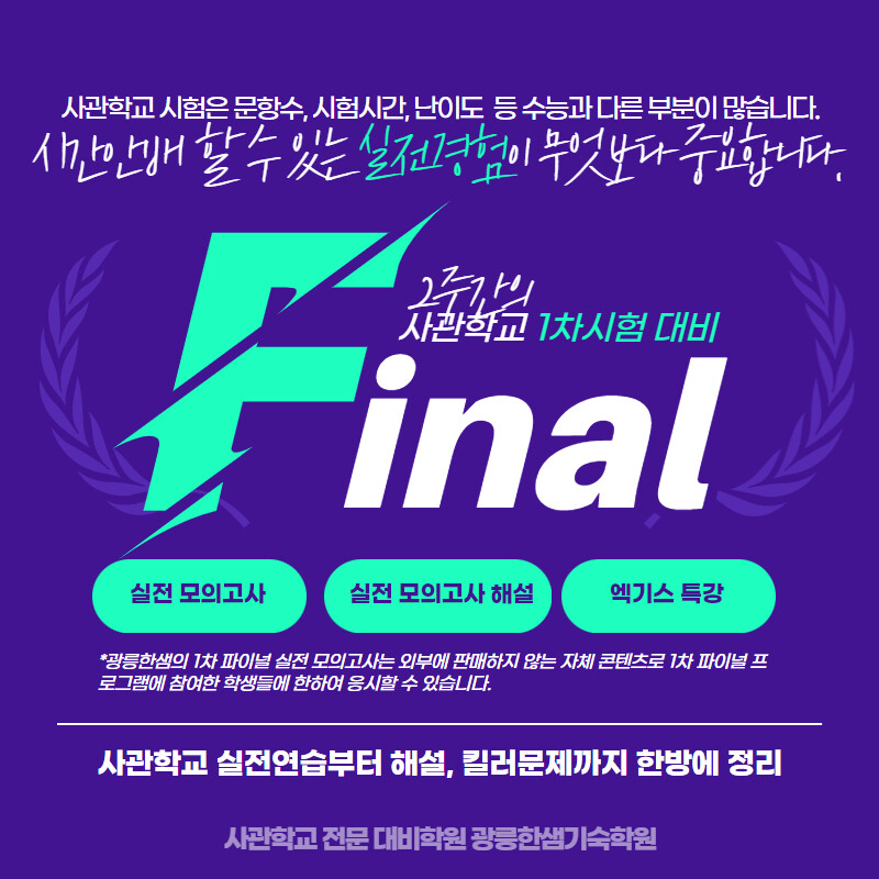 사관학교 1차시험 대비 파이널 방학특강은 5번의 사관실전모의고사와 해설강의, 그리고 과목별 엑기스 특강으로 구성된다.
