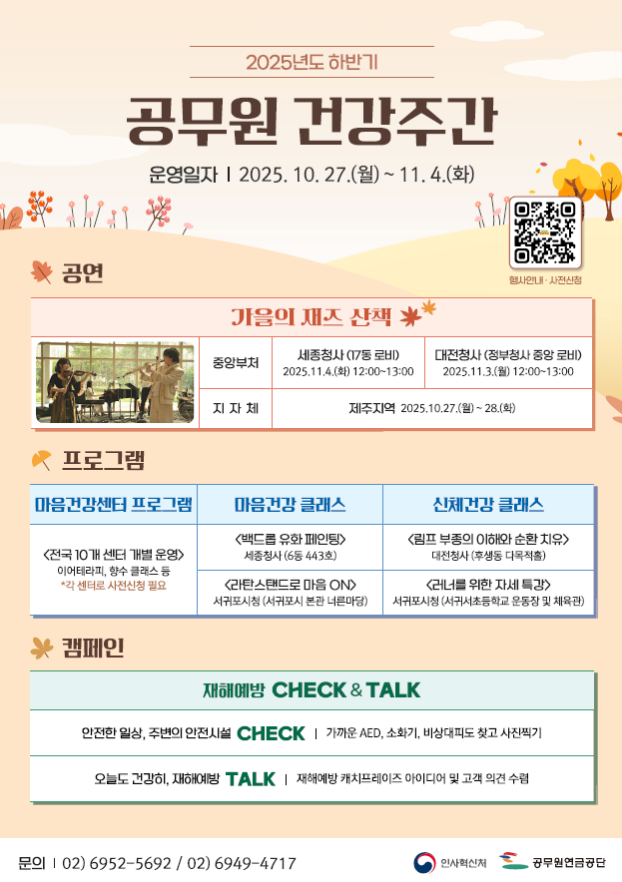 인사혁신처(처장 최동석)와 공무원연금공단(이사장 김동극)은 공무원의 재해 예방과 건강한 공직문화 조성을 위해 ‘2025 하반기 공무원 건강 주간 행사’를 오는 27일부터 11월 4일까지 세종·대전·제주에서 동시에 진행한다고 24일 밝혔다.