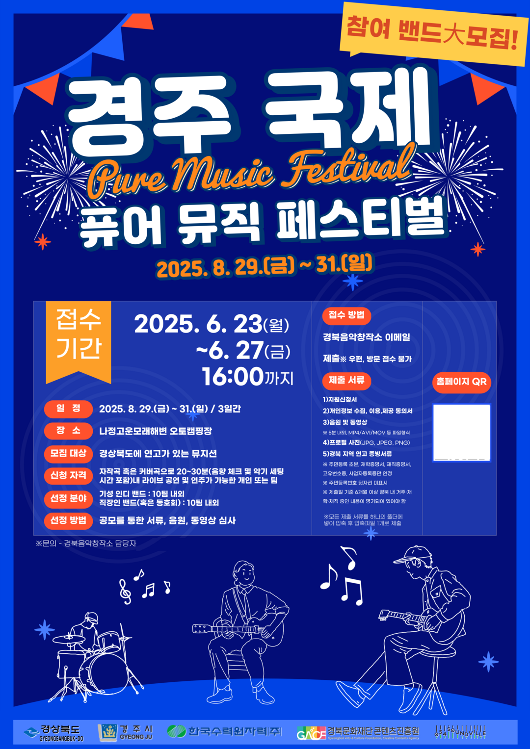 아울러 진흥원 동남권센터는 오는 8월 29일부터 31일까지 경주 나정고운모래해변 오토캠핑장에서 ‘경주 국제 퓨어 뮤직 페스티벌’을 개최한다. APEC 회원국 인디 뮤지션과 국내외 밴드가 참여하는 이번 축제는 지역 대중음악의 글로벌 진출과 K-POP 도시 이미지 구축을 목표로 한다. 참가 밴드 모집은 6월 23부터 27일 후 4시까지 진행되며, 역량있는 음악 창작자들의 많은 관심과 참여가 기대된다.