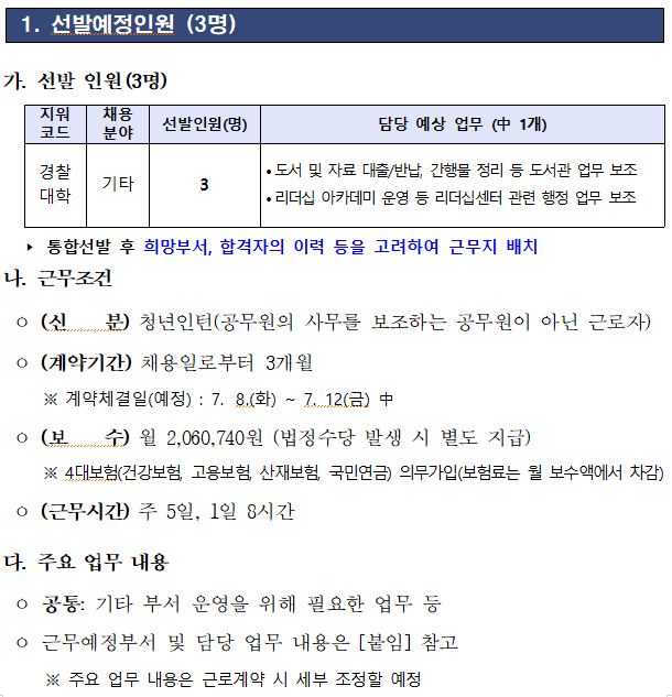 경찰대학에서 근무할 청년인턴을 다음과 같이 공개모집하오니 유능한 인재의 많은 지원 바랍니다.