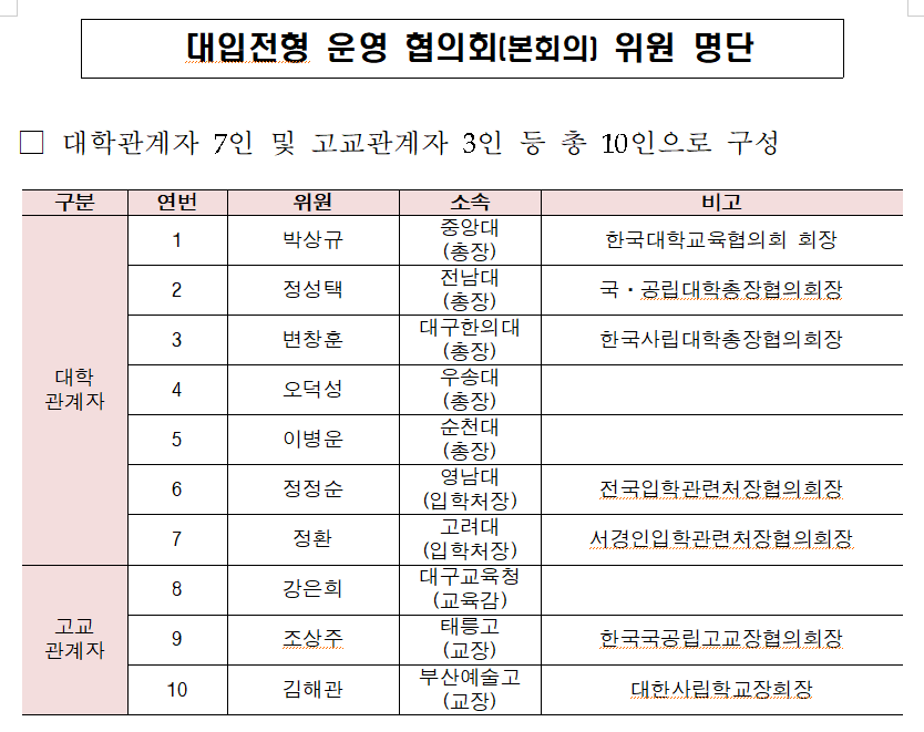 협의회는 대학 총장, 입학처장 등 대학 관계자와 교육감, 교장 등 고교 관계자 총 10인으로 구성되었으며, 이들은 전문성과 대표성을 갖춘 위원들로 위촉되었다. 본회의에서는 협의회 출범 배경과 목적을 공유하고, 향후 운영 계획에 대한 논의가 진행됐다.